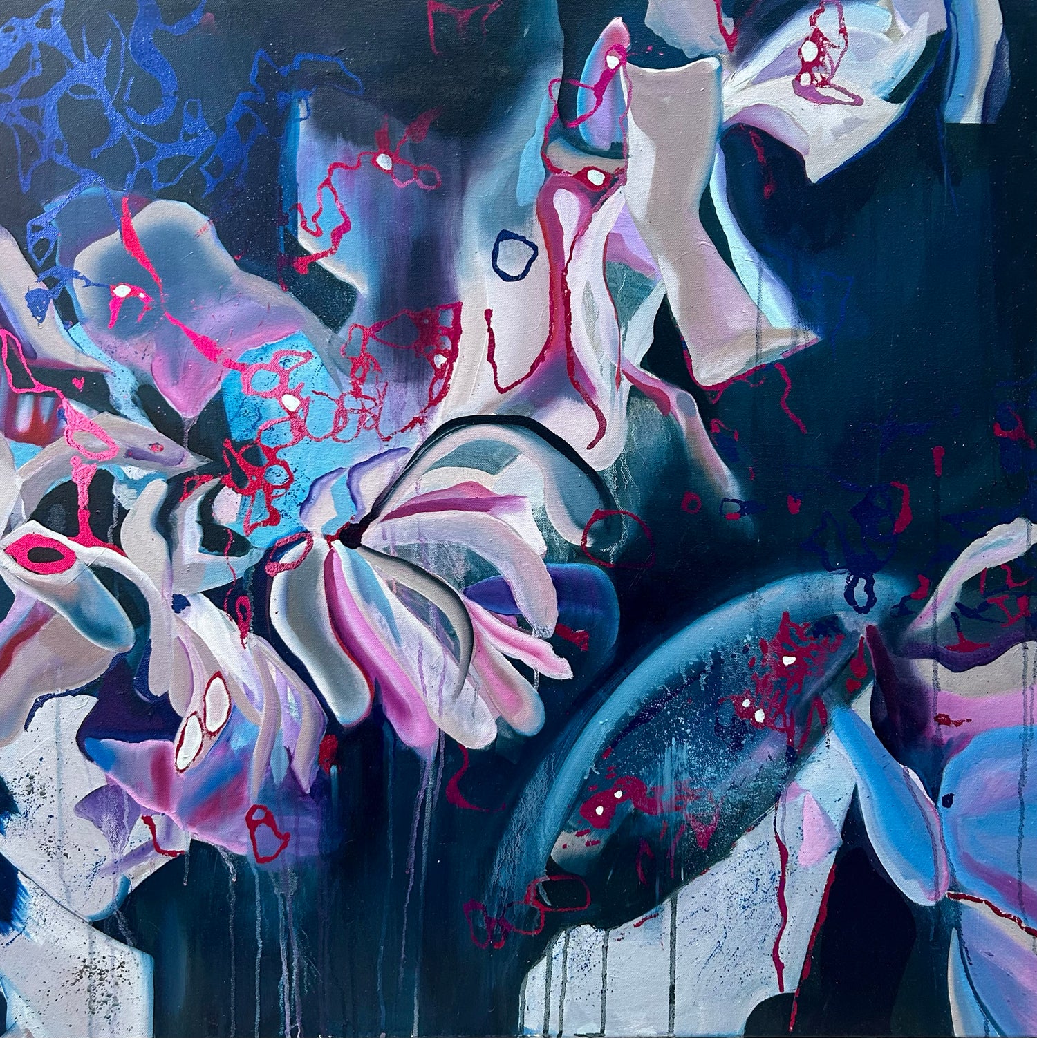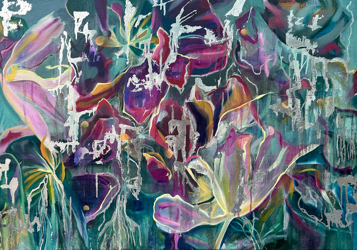 The work is characterised by expressive colour, organic movement and layered abstraction. Botanical influences often appear in fluid forms and natural structures, while coastal works reference light, sea movement and urban textures.